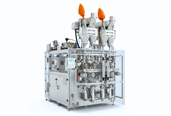 The Flexi Bag 450 Twin Tube vertical form fill and seal machine optimises space and packs different SKUs or different products on individual tubes, offering the highest output per square foot. It accommodates film widths up to 450 mm for various pouch types, including pillow, gusseted, and block bottom bags.